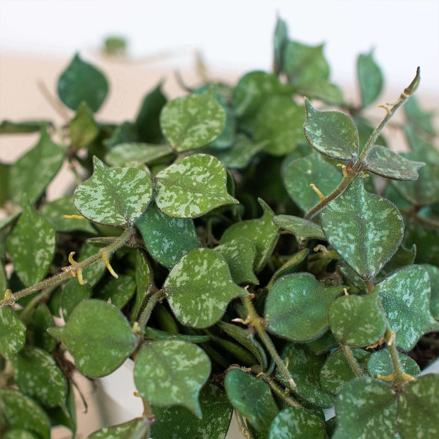 • Description: Hoya curtisii is a miniature trailing hoya. This form of curtisii has small round olive green leaves mottled with grey. The apex is pointed on the thick succulent leaves. This will make a tight mat over the soil surface and then hang down.
